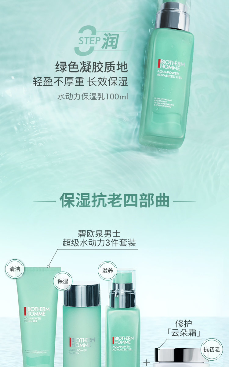 内容物容量或重量125ml+200ml+100ml产品参数适合所有肤质使用期限或开封后使用期限使用期限另行标示,生产日期随时会更新,不便于标示,确切的生产日期请电话咨询 : +82-2-759-6693。使用方法碧欧泉水动力洁面乳 125ml:温和清洁,保湿舒爽双效合一保湿洁面,洗去杂质并温和去除角质,即刻舒爽滋润,洁净不紧绷。功效一:保湿洁面,温和洗去杂质以及男士皮肤分泌的多余皮脂。功效二:温和去角质,通过绵密泡沫促进皮肤更好代谢以及循环。 碧欧泉男士水动力爆水瓶 200ml:使用方法一:早晚于洁面取适量本品,均匀涂抹于面部和颈部,用化妆棉按压擦拭,二次清洁,拭去顽固油脂 使用方法二:早晚于洁面取适量本品,均匀涂抹于面部和颈部,轻轻按摩至水分吸收, 促进后续营养吸收。 碧欧泉男士水动力保湿乳 100ml:早上和/或晚上剃须后,或开始感觉紧绷时,涂抹于洁净肌肤。 取适量产品于掌心。用双手从中心向边缘按摩涂抹至整个面部。 最后涂抹颈部。化妆品制造商,化妆品有限责任销售商及定制型化妆品销售商制造商:L’Oreal / 责任销售商: L’Oreal Travel Retail / 定制型销售商:无相关事项产地法国全部成分